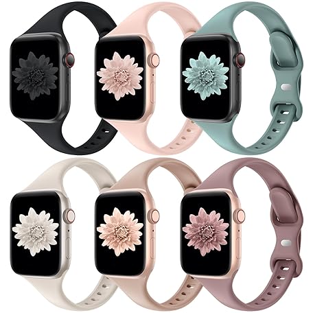 • Distore 6 Pack Thin Slim Bands Compatible with Apple Watch 38mm 40mm 41mm 42mm 44mm 45mm 46mm 49mm Women Men, Replacement Soft Silicone Sport Strap for iWatch Series 10/9/8/7/6/5/4/3/2/1 Ultra SE