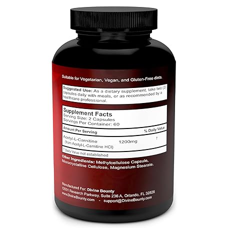 Sản phẩm Divine Bounty Acetyl L-Carnitine Capsules 1200mg Per Serving - L Carnitine Supplement 120 Vegetarian Capsules đang được bán với giá ưu đãi là $21.7455 tại nước Mỹ.