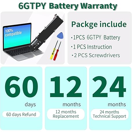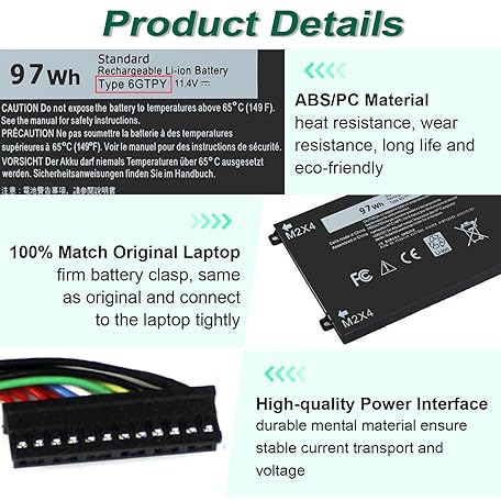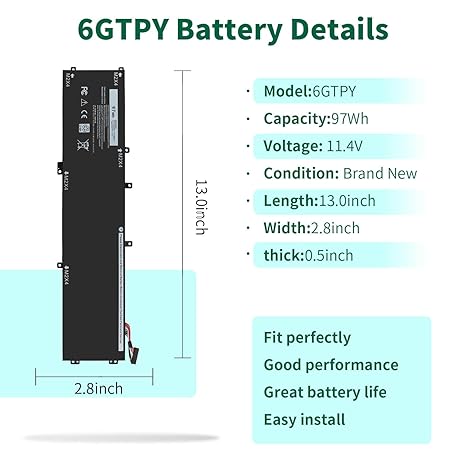 • DMKAOLLK 97Wh 6GTPY Battery for Dell XPS 15 9560 9570 9550 7590 Precision 5510 5520 5530 5540 Vostro 7500 7590 Series 4GVGH GPM03 1P6KD 5XJ28 M2X4 P56F P56F001 11.4V