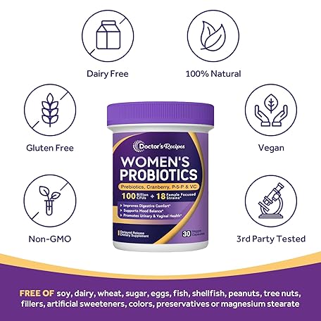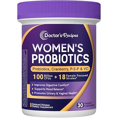 Thông tin sản phẩm Doctor's Recipes Probiotics for Women, 100 Billion CFU, 18 Probiotic Strains, Prebiotics, Cranberry, P-5-P & VC, Shelf-Stable, 30 Vegan Caps