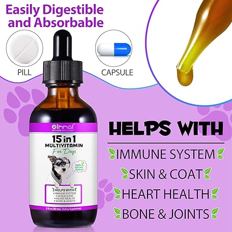 Dog Multivitamin, 15 in 1 Dog Multivitamin Liquid Drops Supplements for Skin & Coat, Heart Health, Bones and Joint, Dogs Vitamins with Glucosamine and MSM, Immune System Support -60ml