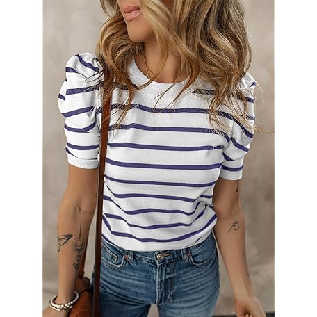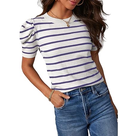 Sản phẩm Dokotoo Women's Short Puff Sleeve Knit Tops 2025 Trendy Crewneck Striped T Shirts Casual Summer Blouses đang được bán với giá ưu đãi là $28.2092 tại nước Mỹ.