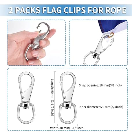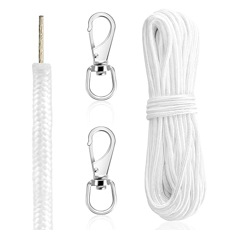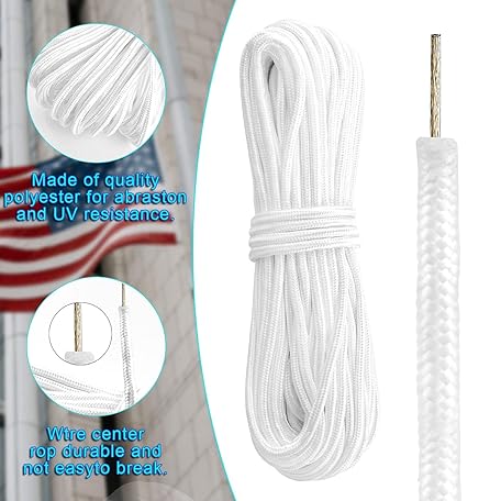 DOSTATNI 50 Feet 1/4 Inch Wire Flagpole Rope with Clips Set Wire Center Halyard Rope with 2 Pieces Stainless Steel Snap Hooks Braided Polyester Halyard Line with Wire Core Center for Flagpole (White)