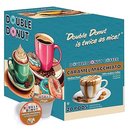 Thông tin sản phẩm Double Donut Coffee Caramel Macchiato Flavored Coffee Pods, Medium Roast Coffee, for Keurig K Cups Machines, in Recyclable Pods, 20 Count