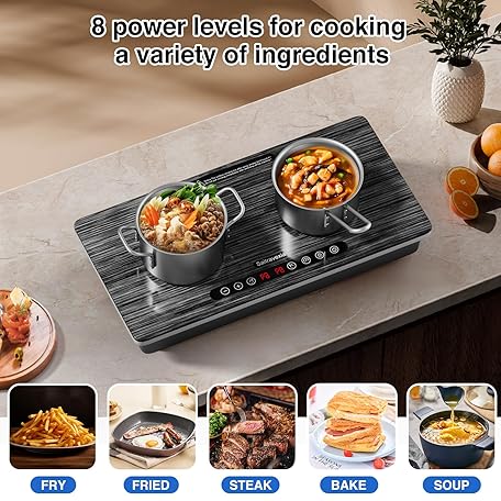 Thông tin sản phẩm Double Induction Cooktop, 1800W Portable Electric Stove, 18 Inch Sensor Touch Electric Cooker Hot Plate, 5.91" Heating Coil, Child Lock, 8 Power Levels, 110v Outlet Plug with Glass Surface