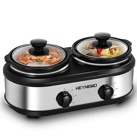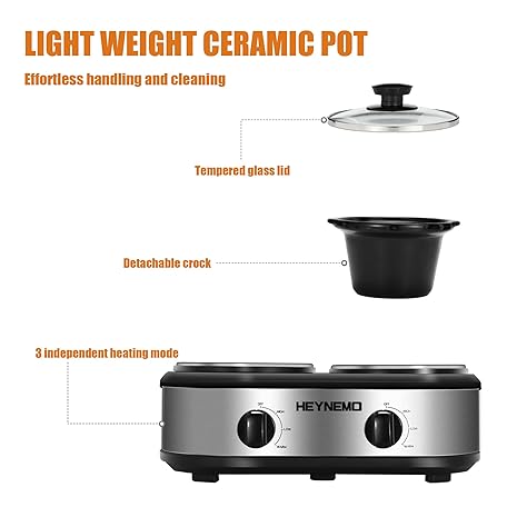 Thương hiệu HEYNEMO là cái tên nổi tiếng được rất nhiều khách hàng trên thế giới chọn lựa. Với kiểu dáng đẹp mắt, sang trọng, sản phẩm Double Slow Cooker, Buffet Servers and Warmers, Dual 2 Pot Slow Cooker Food Warmer, Adjustable Temp Dishwasher Safe Removable Ceramic Pot Glass Lid, 2 x 1.25 QT Portable Small Crock Cooker là sự lựa chọn hoàn hảo nếu bạn đang tìm mua một món cho riêng mình.