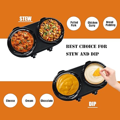 Thông tin sản phẩm Double Slow Cooker, Buffet Servers and Warmers, Dual 2 Pot Slow Cooker Food Warmer, Adjustable Temp Dishwasher Safe Removable Ceramic Pot Glass Lid, 2 x 1.25 QT Portable Small Crock Cooker