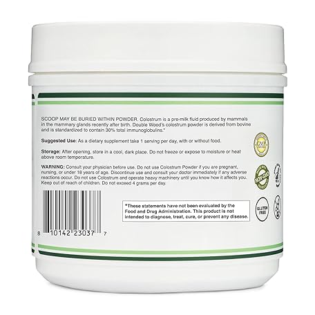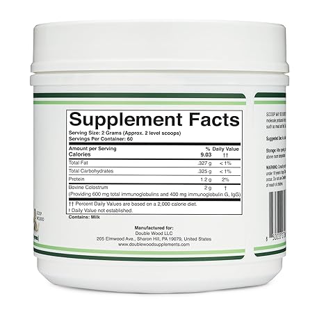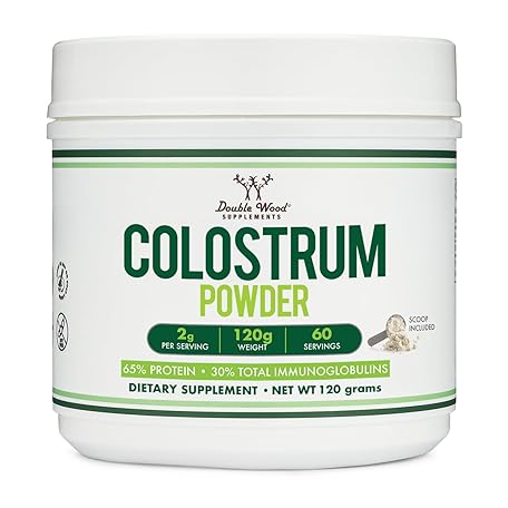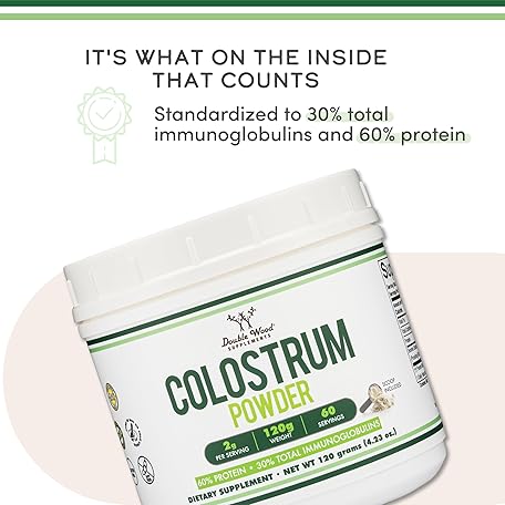 Double Wood Supplements Bovine Colostrum Powder for Women and Men, for Gut Health, Skin & Hair, Immune Support (120 Grams, 60 Day Supply - Standardized to 30% Total Immunoglobulins and 60% Protein)