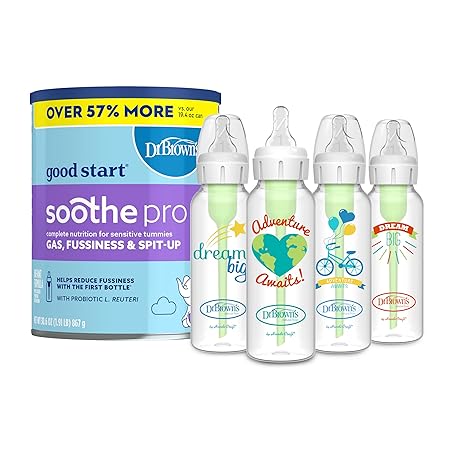 Dr. Brown's Good Start Baby Formula Powder, 30.6 Ounce & Natural Flow Anti-Colic Options+ Narrow Baby Bottle, Dream Adventure, 8 oz/250 mL, with Level 1 Slow Flow Nipple, 0m+, 4 Count