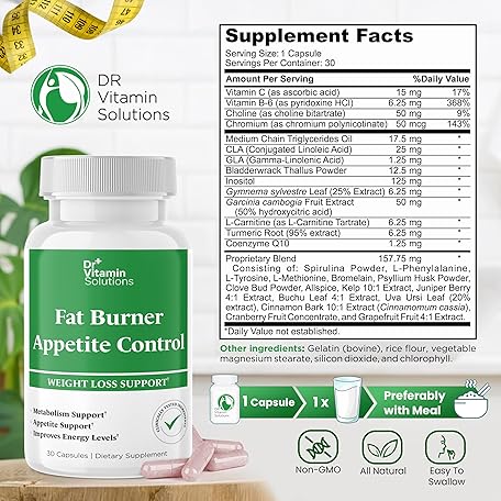 Thông tin sản phẩm DR VITAMIN SOLUTIONS Fat Burner & Appetite Control Weight Loss Supplements for Women & Men - Metabolism Booster w/L-Carnitine, CLA, Chromium - Appetite Suppressant for Weight Loss - 30 Capsules