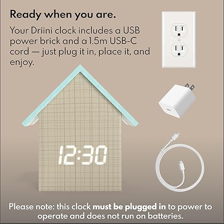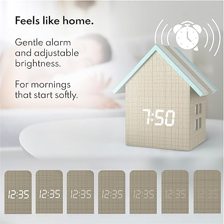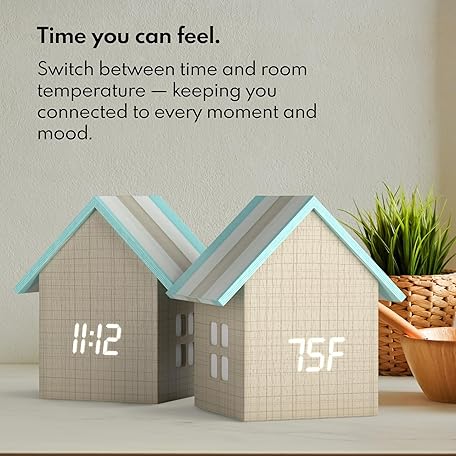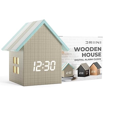 Driini Digital House Shaped Alarm Clock with Temperature Display (Stripe Wood) – Modern Aesthetic - Cute Cube Frame and White LED Dimmer - Perfect Large Desk Clock for Bedside Table or Bedroom Mantle