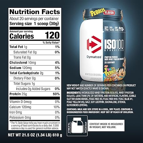 Thông tin sản phẩm Dymatize x Fruity Pebbles ISO100 Whey Protein Powder Isolate, 25g of Protein, 5.5g BCAAs, 120 Cal., Gluten Free, 1g Fat, 1g Sugar, 2g Carb (20 Servings)