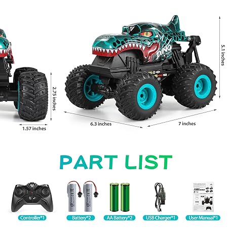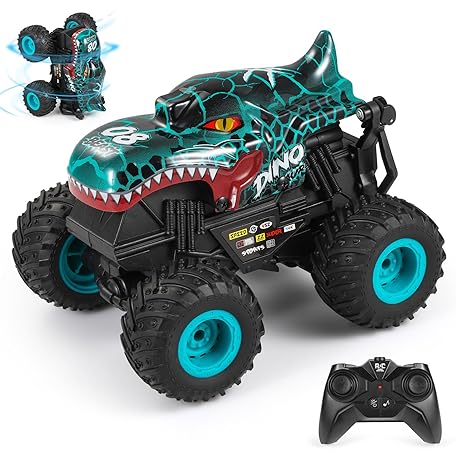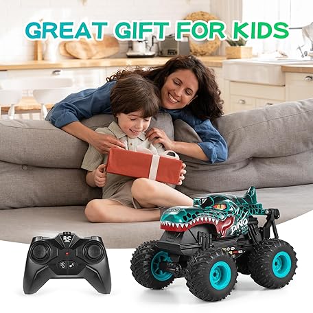 Thông tin sản phẩm DYODYORC Remote Control Car, 2.4Ghz All Terrain Dinosaur Monster Truck Toys, RC Truck with Music, 3 Lighting Effects, 360 Stunt Capable, 2 Batteries Ready to Run, Toy Gifts for Boys and Girls (Cyan)