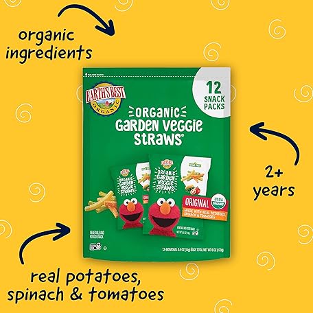 Earth's Best Organic Kids Snacks, Sesame Street Toddler Snacks, Organic Garden Veggie Straws for Toddlers 2 Years and Older, Original, Multipack, .5 oz Bags, 12 Count (Pack of 2)