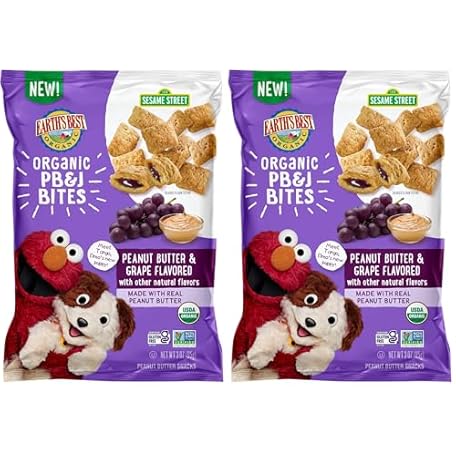 Earth's Best Organic Kids Snacks, Sesame Street Toddler Snacks, Organic PB&J Bites for Toddlers 2 Years and Older, Peanut Butter and Grape Flavored with Other Natural Flavors, 3 oz Bag (Pack of 2)