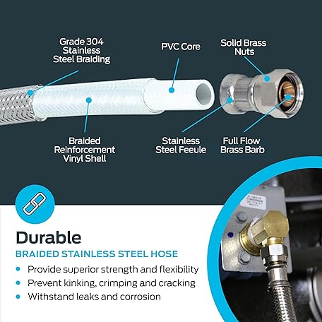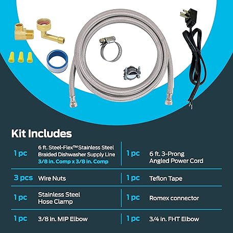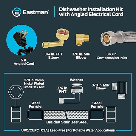 Thông tin sản phẩm Eastman 6 Ft. Dishwasher Installation Kit, Braided Stainless Steel Supply Line with 3/8 Inch Compression Ends, 3-Prong Angled Power Cord, 48337N