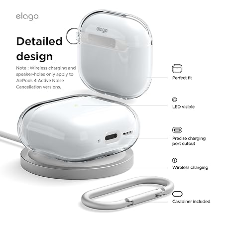 • elago Clear Case for AirPods 4 - Compatible with AirPods 4th Gen, Carabiner Included, Reduced Yellowing, Wireless Charging, Shock Resistant, Full Protection (Transparent)