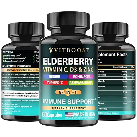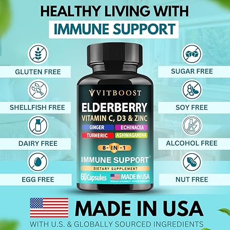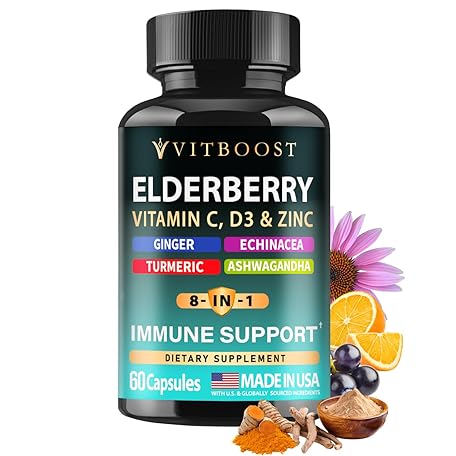 Thương hiệu VITBOOST là cái tên nổi tiếng được rất nhiều khách hàng trên thế giới chọn lựa. Với kiểu dáng đẹp mắt, sang trọng, sản phẩm Elderberry Immune Support Supplement 8-in-1 Formula with Echinacea, Vitamin C & Zinc, Vitamin D 5000 IU, Turmeric, Ginger, Ashwagandha – 60 Capsules là sự lựa chọn hoàn hảo nếu bạn đang tìm mua một món cho riêng mình.