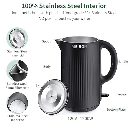 Thương hiệu MEISON là cái tên nổi tiếng được rất nhiều khách hàng trên thế giới chọn lựa. Với kiểu dáng đẹp mắt, sang trọng, sản phẩm Electric Kettles Stainless Steel for Boiling Water, Double Wall Hot Water Boiler Heater, Cool Touch Electric Teapot, Auto Shut-Off & Boil-Dry Protection, 120V/1200W, 1.7 Liter, 2 Year Warranty (black) là sự lựa chọn hoàn hảo nếu bạn đang tìm mua một món cho riêng mình.