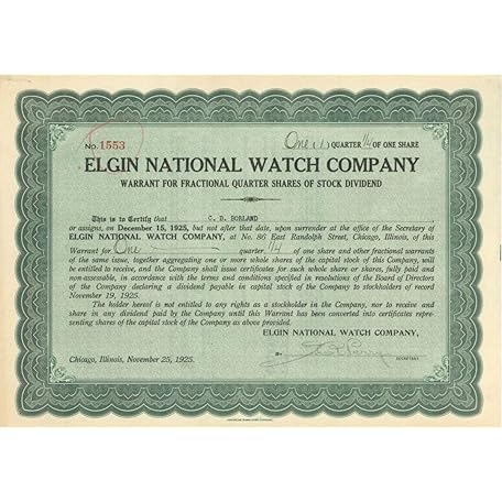 Elgin National Watch Co. - 1925 dated Timepiece Stock Certificate - Watch Maker from 1864 to 1968