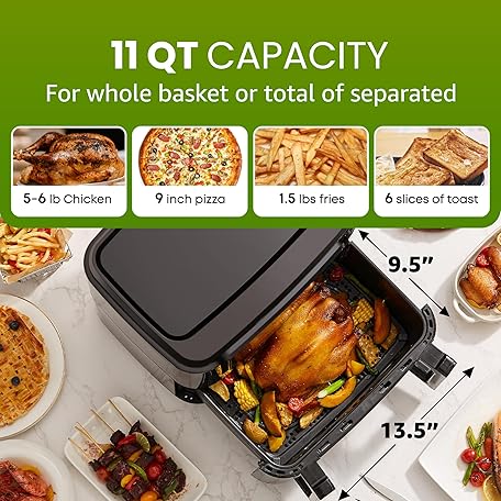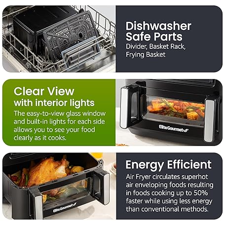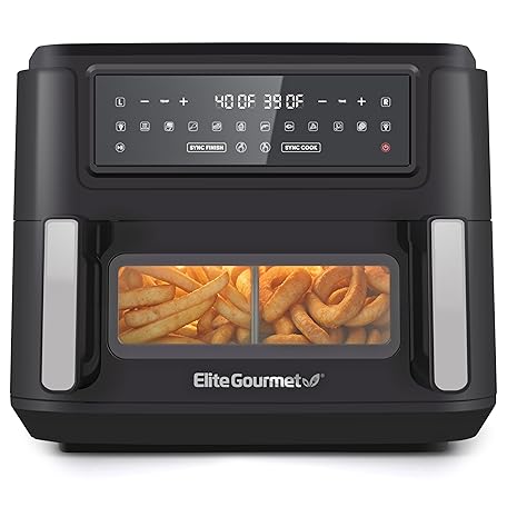 Thông tin sản phẩm Elite Gourmet EAF1055D Dual Zone Air Fryer Oven, 11QT. Capacity with Divider, Sync Finish, Dishwasher Safe Basket, 10 Preset Functions, 1600-Watts, with Recipe Booklet, Black