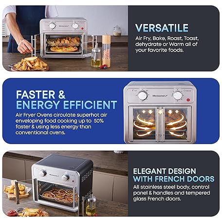 Thông tin sản phẩm Elite Gourmet EAF1222SS Air Fryer Oven Double French Doors, Bake, Grill, Roast, Broil, Rotisserie, Toast, Warm, Air Fry, Dehydrate, 1500 Watts, with 25 Recipes, 12L. Capacity, Stainless Steel