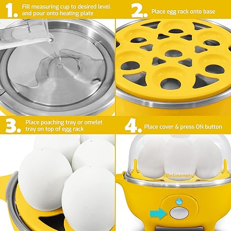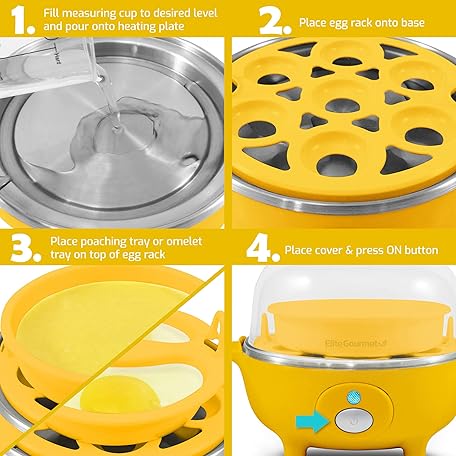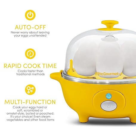 Thông tin sản phẩm Elite Gourmet EGC-007Y# Rapid Egg Cooker, 7 Easy-To-Peel, Hard, Medium, Soft Boiled Eggs, Poacher, Omelet Maker, Auto Shut-Off, Alarm, 16-Recipe Booklet, Yellow