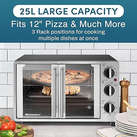 Thông tin sản phẩm Elite Gourmet ETO2530M Double French Door Countertop Toaster Oven, Bake, Broil, Toast, Keep Warm, Fits 12" pizza, 25L capacity, Stainless Steel & Black