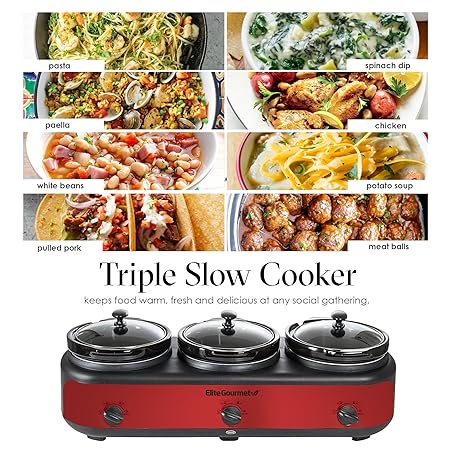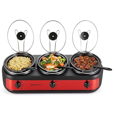 Thông tin sản phẩm Elite Gourmet EWMST-325R Maxi-Matic Triple Slow Cooker Buffet Server Adjustable Temp Dishwasher-Safe Oval Ceramic Pots, Lid Rests, 3 x 2.5 Qt Capacity, Red
