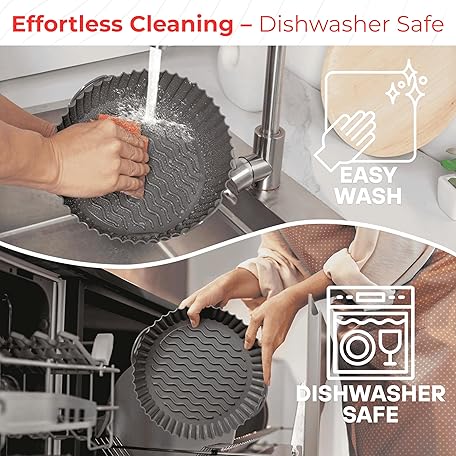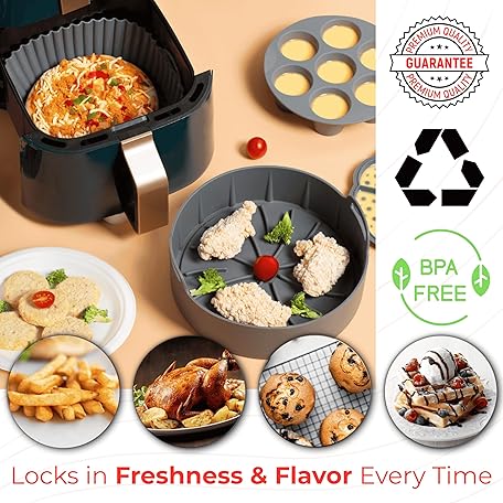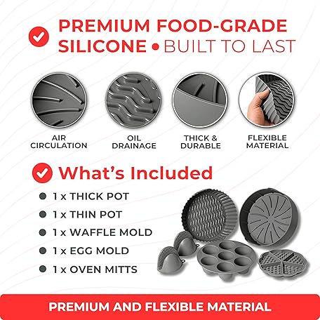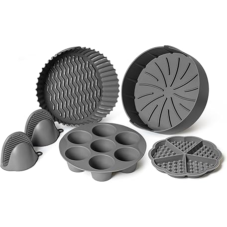 Thông tin sản phẩm EM Set of 5 Silicone Air Fryer Liners with Egg Bite Mold, Waffle Mold & Mitts - 7.5” Round Reusable Silicone Inserts for 3-5 Qt Airfryers - Easy to Clean & Heat-Resistant Air Fryer Accessories Set