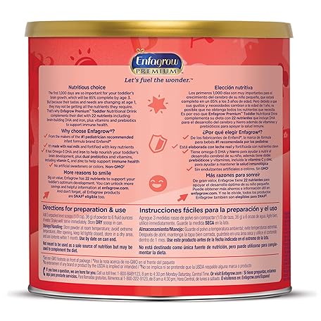 Thông tin sản phẩm Enfagrow PREMIUM Toddler Nutritional Drink, Made with Real Milk, Brain-Building Omega-3 DHA, Nutrients and Prebiotics for Growth & Immune Support, Non-GMO, Toddler Milk Powder, 24 Oz Can
