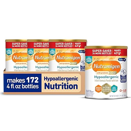 Thông tin sản phẩm Enfamil Nutramigen Hypoallergenic Baby Formula with Iron, Lactose Free, Colic Relief from Cow's Milk Allergy Starts in 24 Hours, Brain Building DHA, Probiotic LGG for Immune Support, 27.8 Oz, 4 Count