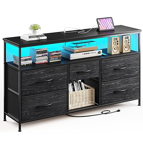 EnHomee TV Stand with LED Lights & Power Outlets, Entertainment Center for 50" Inch TV, 5 Drawers TV Stand for Bedroom Dresser with Shelves for Living Room, Sturdy Metal Frame, Black