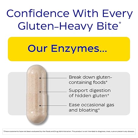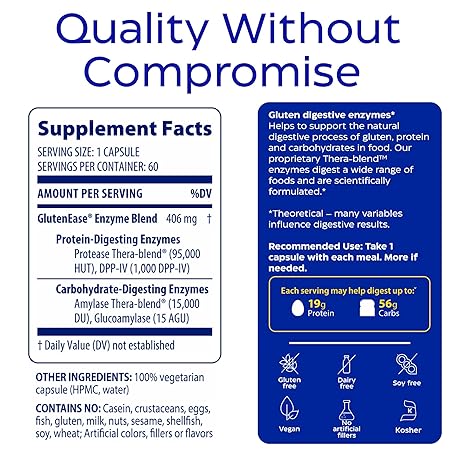 Thông tin sản phẩm Enzymedica GlutenEase, Advanced Digestive Enzymes for Women and Men, Fast-Acting Formula for Bloating Relief & Digestive Health, Helps Break Down Gluten & Casein, 60 Capsules FFP