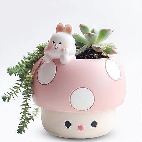 EOBTAIN Unique Mushroom Planter Pot Cute Animal Rabbit Pink Resin Succulent Small Pots for Indoor Plants Mini Cactus Planter Pots Living Room Office Table Decor,Mushroom Lover Gifts,4 Inch