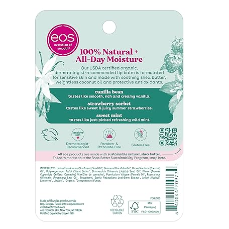 Thông tin sản phẩm eos 100% Natural & Organic Lip Balm Trio- Vanilla Bean, Sweet Mint, & Strawberry Sorbet, Made for Sensitive Skin, Lip Care Products, 0.14 oz, 3-Pack