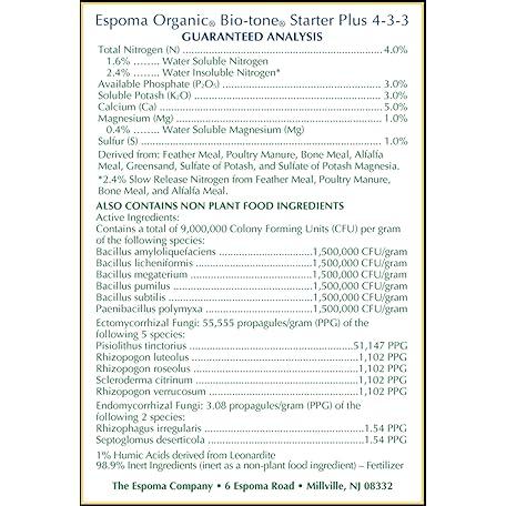 Sản phẩm Espoma Organic Bio-Tone Starter Plus 4-3-3 Natural & Organic Starter Plant Food with Both Endo & Ecto Mycorrhizae; 4 lb. Bag; The Ultimate Starter Plant Food đang được bán với giá ưu đãi là $15.5325 tại nước Mỹ.