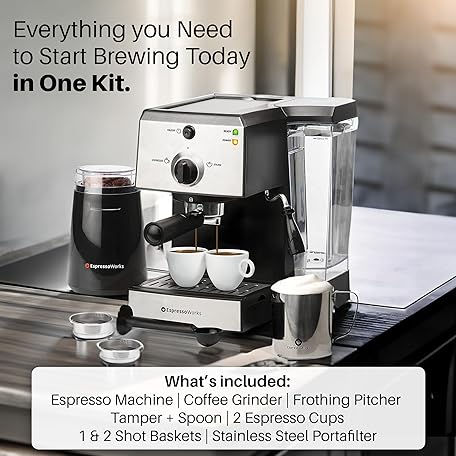 Thông tin sản phẩm EspressoWorks All-In-One Espresso Machine with Milk Frother 7-Piece Set - Latte Maker Includes Grinder, Frothing Pitcher, Cups, Spoon and Tamper - Coffee Gifts (Stainless Steel)