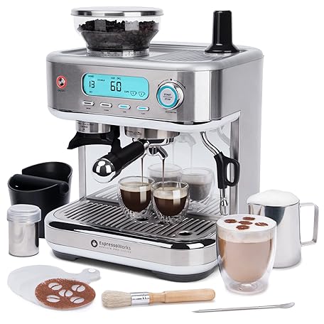 Thông tin sản phẩm EspressoWorks Barista Pro Series Espresso Machine with Grinder, LCD Display and Steamer - Ready To Go In 60 Sec - 15-Bar Latte and Cappuccino Machine 30-Piece Bundle - Coffee Gifts (Silver)