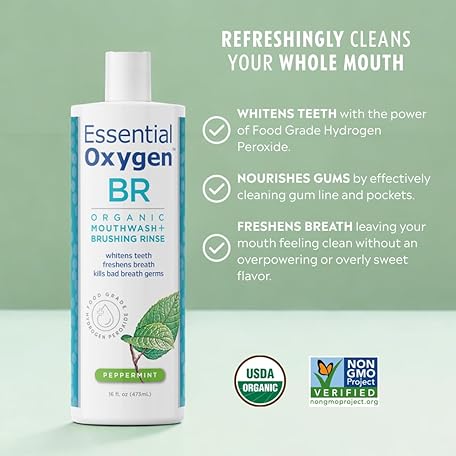 Thông tin sản phẩm Essential Oxygen Certified BR Organic Brushing Rinse, All Natural Mouthwash for Whiter Teeth, Fresher Breath, and Happier Gums, Alcohol-Free Oral Care, Peppermint, 16 Ounce, Package may vary