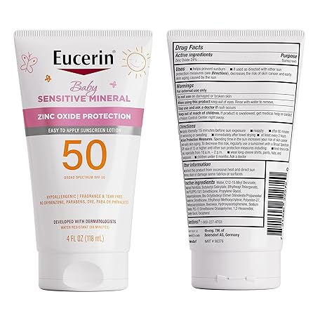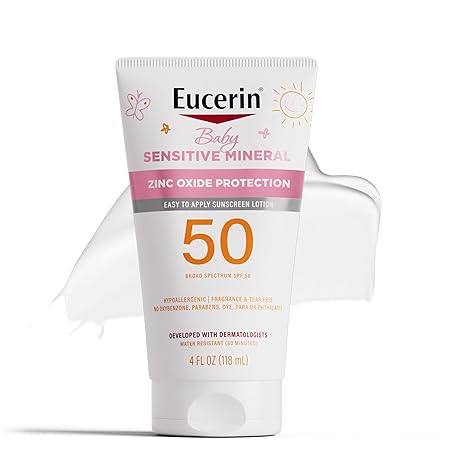 Thông tin sản phẩm Eucerin Sun Sensitive Mineral Baby Sunscreen Lotion SPF 50 with Zinc Oxide Protection, Hypoallergenic Mineral Sunscreen for Babies, Tear Free and Fragrance Free, 4 Fl Oz Tube