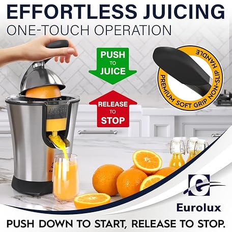 Thông tin sản phẩm Eurolux Premium Electric Orange Juicer | Stainless Steel Citrus Squeezer With New Ultra-Powerful Motor and Soft Grip Handle for Effortless Juicing, Auto Shutoff, Dishwasher-safe Parts, Pulp Control