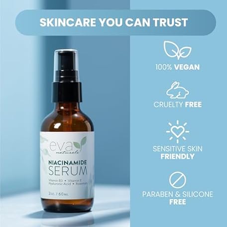 Thông tin sản phẩm Eva Naturals Niacinamide 5% Serum for Face – B3 Pore Minimizer, Acne Treatment & Dark Spot Corrector with Hyaluronic Acid, Vitamin E, Aloe & Neem – Anti-Aging, Non-Greasy, Hydrating, 2oz