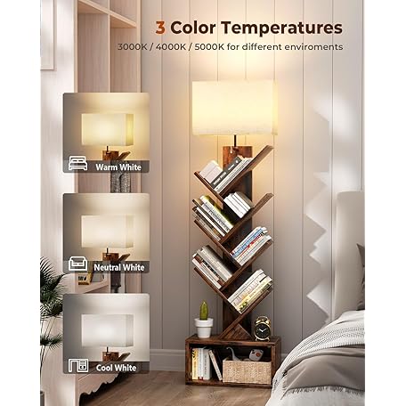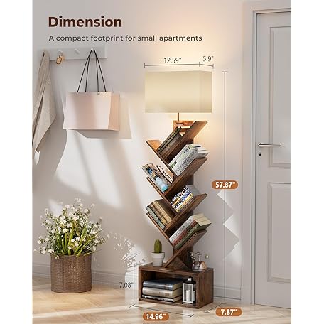 Thông tin sản phẩm Evermagin 6 Tier Tree Bookshelf with Light, Narrow Bookcase Tower, Tall Floor Standing Book Organizer with Storage Cabinet for Living Room, Bedroom and Home Office, Rustic Brown