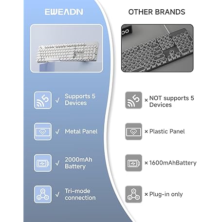 Thông tin sản phẩm EWEADN TK950 Typewriter Keyboard Wireless Mechanical Keyboard, 104 Keys Aesthetic Typewriter Keyboards with White Backlit, Anti-Ghosting, Blue Switch Bluetooth/2.4GHz/Wired Keyboards-White