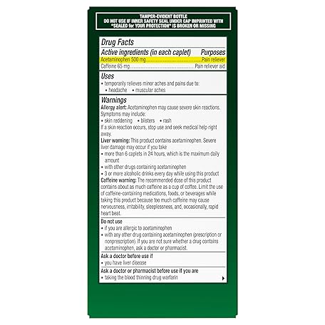Thông tin sản phẩm Excedrin Tension Headache Relief Caplets, Acetaminophen 500mg, Caffeine 65mg, Pain Reliever, Aspirin-Free, 100 Count