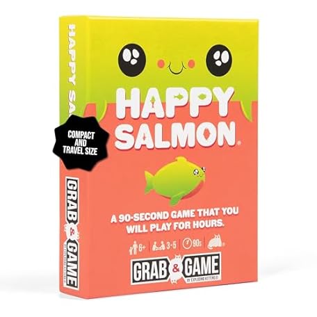 Exploding Kittens Happy Salmon Grab & Game - 3-8 Players - Ages 6+ - 90 Second Rounds - Travel Sized Cards - Easy to Learn Quick Matching - Party, Family Night, Kids and Adults