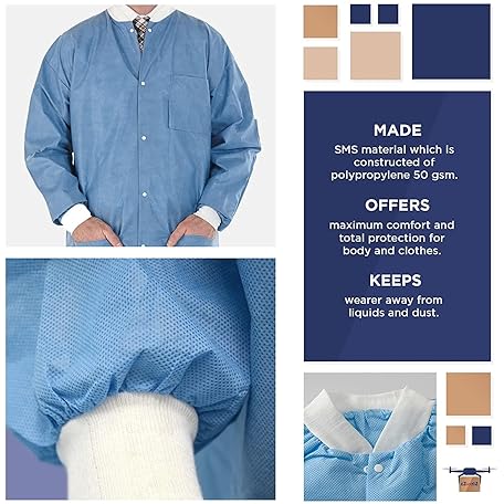 • EZGOODZ Disposable Lab Jacket, 31 Inches Long. Pack of 10 Ceil Blue Hip-Length Workwear Large. SMS 50 gsm Disposable Shirts with Snaps Front, Knit Cuffs & Collar, 3 Pockets. Unisex PPE Coat