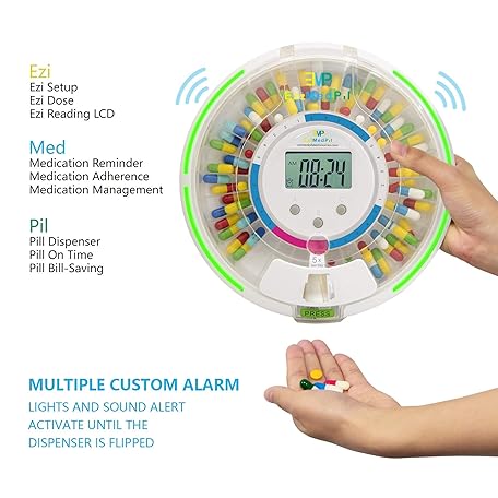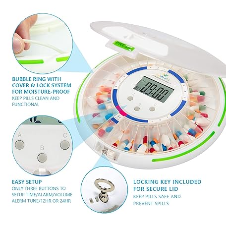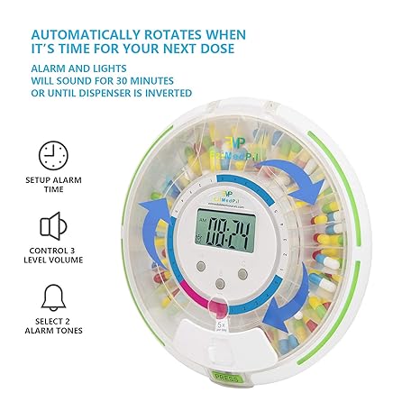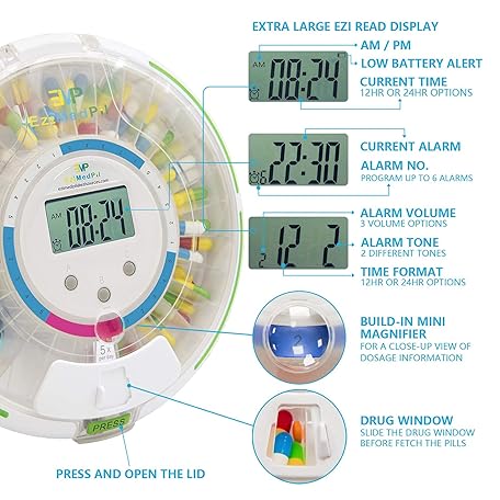 Thông tin sản phẩm EziMedPil Automatic Pill Dispenser w/Audio & Visual Alerts, up to 6 Alarms/day, 6 Dosage Templates, Easy-Read LCD Display, Lock Medication Dispenser w/Key for Prescriptions, Vitamins & More, Clear Lid
