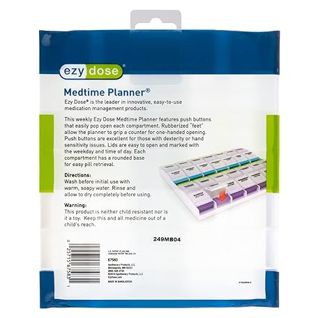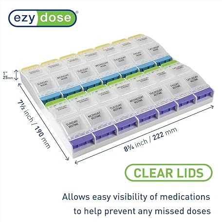 Thông tin sản phẩm EZY DOSE Weekly (7-Day) Pill Organizer, Vitamin Container, and Daily Medicine Planner, 2X-Large Push Button Compartments, Arthritis Friendly, Easy to Use, 4 Times a Day, Clear Lids, BPA Free